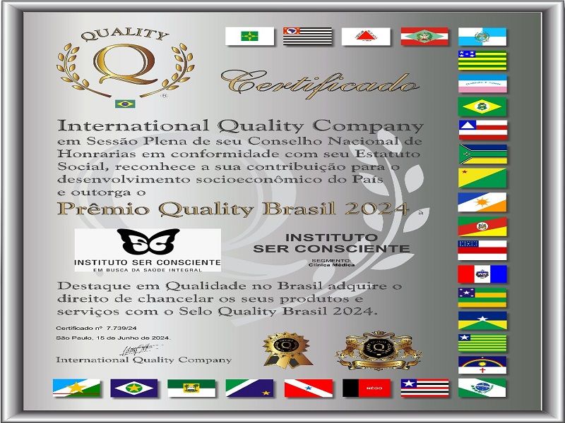 O International Quality Company em Sessão Plena de seu Conselho Nacional de Honrarias em conformidade com seu Estatuto Social, reconhece a sua contribuição para o desenvolvimento socioeconômico do País e outorga o Prêmio Quality Brasil 2024 ao Instituto Ser Consciente. Mais um prêmio confirmando que estamos no caminho certo. Muito orgulhosos do trabalho de todos os envolvidos no projeto que está iniciando com muito sucesso e amor. O Instituto Ser Consciente continua com sua missão de promover saúde e bem-estar à população.